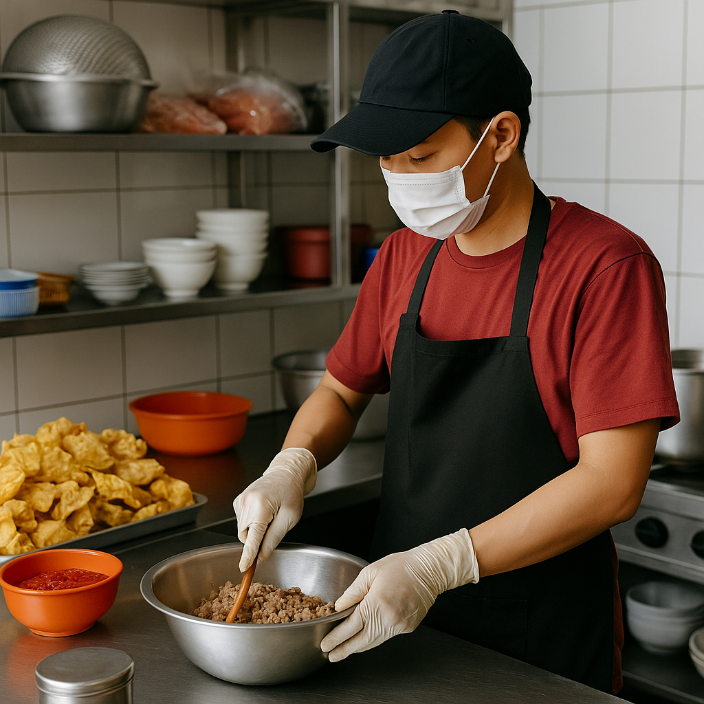 Membuat bahan dasar: topping ayam kecap, sambal, pangsit, siomay, cakwe, dll.