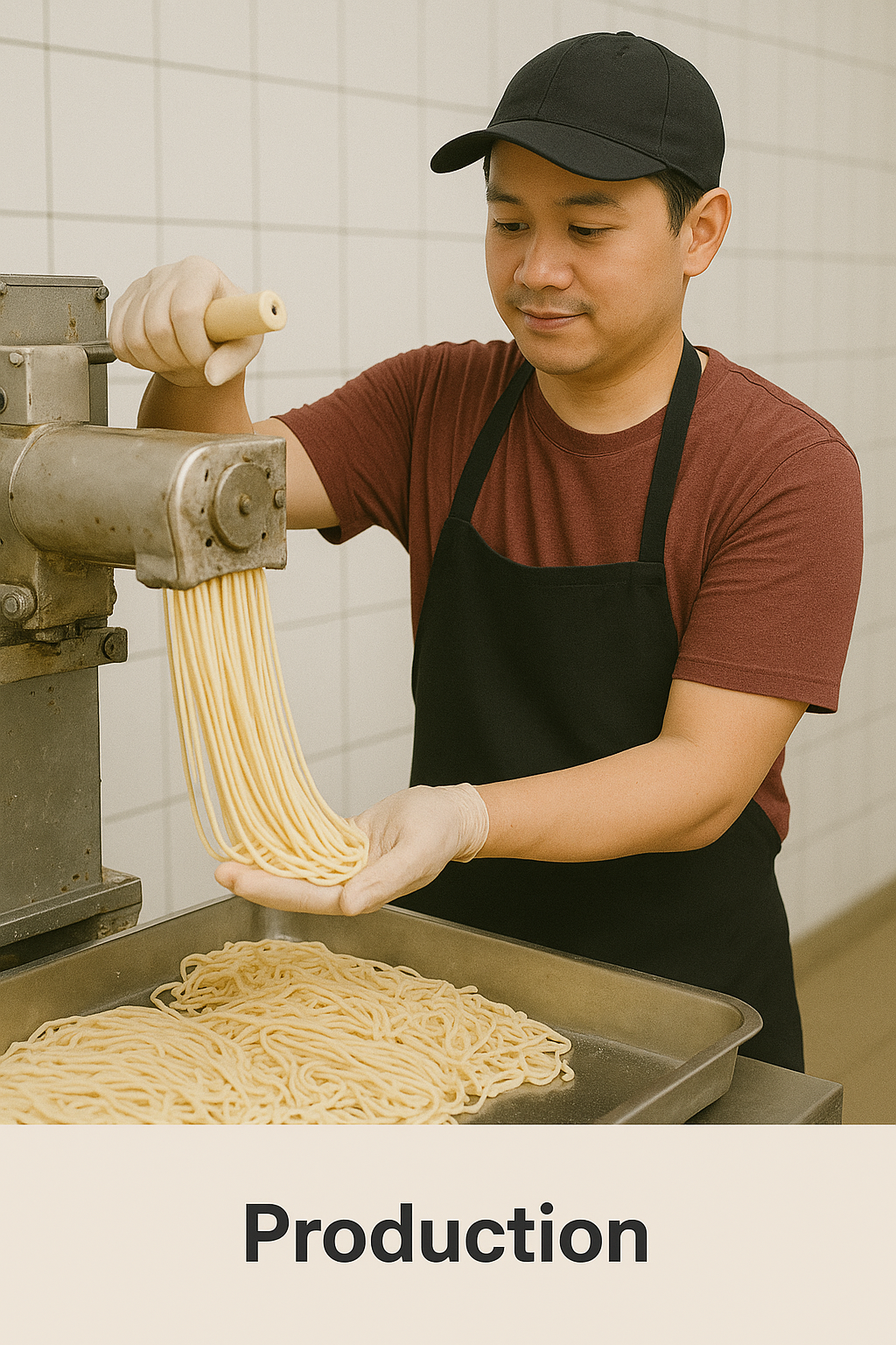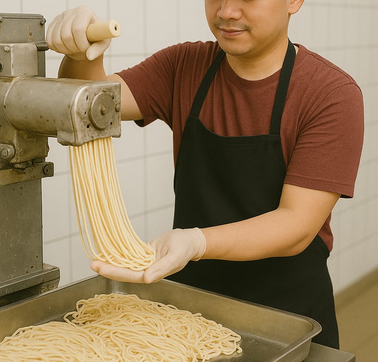 Mengoperasikan mesin pembuat mie dan memastikan hasilnya sesuai standar.